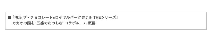 ザ ロイヤルパークホテル 福岡(総支配人:清水 康年)は、株式会社 明治(代表取締役社長:松田 克也)の「明治 ザ・チョコレート」リニューアルを記念して、「明治 ザ・チョコレート」を通じてカカオの生産国(ベネズエラ、ブラジル、ペルー、ドミニカ共和国)を“五感でたのしむ”コラボルームの宿泊プランを2022年11月7日(月)~2023年1月31日(火)の期間限定で実施します。また、同コラボルームの予約受付を11月3日(木・祝)12時より開始いたします。