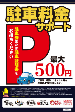 駐車券1枚につき最大500円割引ですので、駐車場ご利用の方は、グループで何名様でもご利用頂けます。