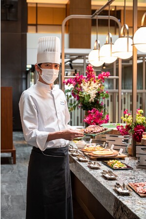 15種のアンティパスティと選べる7種のメインディッシュは、イタリアングリル「メロディア」シェフ山本 健太郎による、オリジナリティーあふれるシーズナルクリエイションをお届けします。もちっと芳しく食欲をそそるスカモルツァチーズや、根セロリの芳醇な香りがアクセントのホワイトカラーのソースを、イタリア料理ではなかなか味わうことのできない真ふぐのグリルと合わせて。さらに12月25日までの土日祝日限定でホリデーシーズンを一層盛り上げるカービングステーションもご用意。テイクアウト商品でも大好評のローストチキンやローストビーフなど、週ごとに異なるこだわりのメインディッシュをシェフが目の前でお好きなだけお取り分けします。デザート10種は、エグゼクティブペストリーシェフ長田 学による愛らしいフォトジェニックなスイーツをバラエティ豊かに。いちごタルト、みかんジュレ、ベイクドチーズケーキやティラミスなど全種類食べつくしたいほどの大満足のラインナップです。