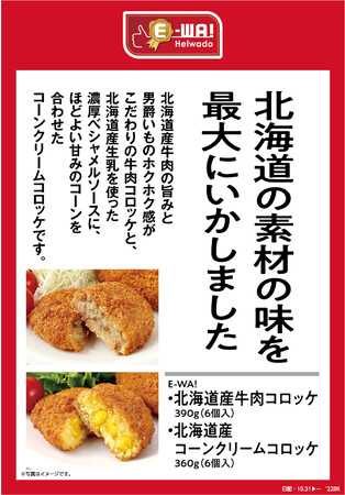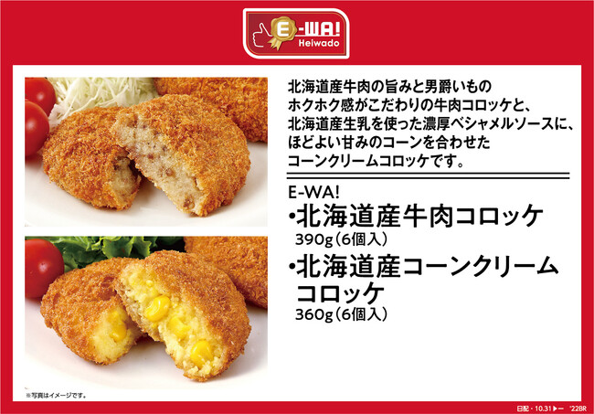 株式会社平和堂(本社:滋賀県彦根市、代表取締役社長執行役員:平松正嗣)は、平和堂こだわりブランドE-WA!の新商品として、「北海道産牛肉コロッケ」と「北海道産コーンクリームコロッケ」の冷凍食品を、2022年11月3日(木)より平和堂・エールの158店舗で新発売いたします。E-WA!ブランドサイト https://e-wa.heiwado.jp/