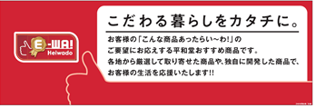 ・メインメッセージ:お客様の「こんな商品あったらい~わ!」のご要望にお応えする平和堂こだわりブランドです。各地から厳選して取り寄せた商品や、独自に開発した商品で、お客様の生活を応援いたします!!