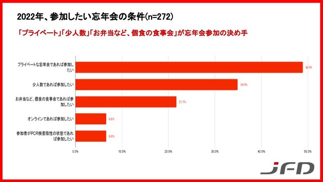 ・2022年、対面での忘年会について「未定・参加したくない」と回答した人に、参加したい忘年会の条件を尋ねたところ、「プライベートな忘年会であれば参加したい(48.9%)」と答えた人が最も多く、次いで「少人数であれば参加したい(34.9%)」、「お弁当など、個食の忘年会であれば参加したい(21.7%)」という回答が続きました。