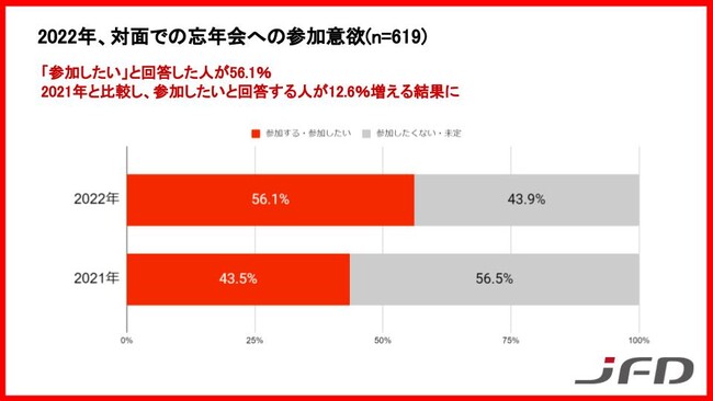 2022年対面での忘年会が開催された場合、「参加したい」と答えた人が56.1%、「未定・参加したくない」と答えた人が43.9%でした。昨年と比較し、12.6% 「参加したい」と答える人が増える結果となりました。