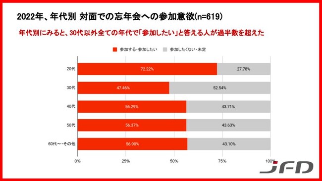●2022年対面での忘年会が開催された場合「参加したい」と回答した人を年代別に見ると、30代以外全ての年代において過半数の人が「参加したい」と回答しました。
