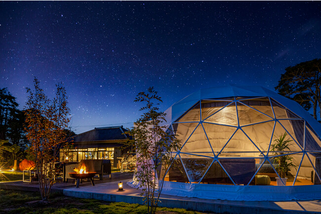 大空を見渡す緑豊かな敷地内には大人気の大型ドームテント設置。食事はフレンチシェフによる地元食材をふんだんに使った創作フレンチのフルコースを堪能。自然が織りなす絶景と本格フレンチで、一味違うグランピングステイを叶えます。
