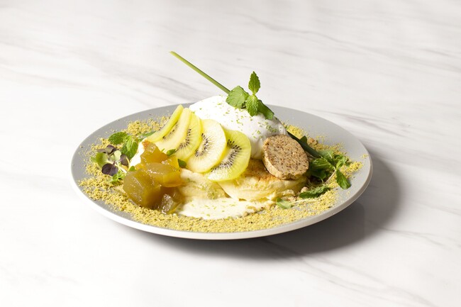 キウイ/メロンコンフィチュール/マイクロリーフ/グリーンアップルサワークリーム/ピスタチオ/グラノーラ/ライムゼスト