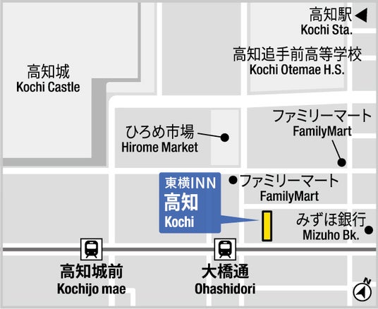 東横INNで361店舗目となる「東横INN高知」は、繁華街の中央部で、とさでん交通「大橋通」目の前に位置し、近くには高知の食の魅力がつまった「ひろめ市場」があります。そんな繁華街や高知城の眺望を楽しんでいただけるよう、最上階に朝食会場を設けて、ビュッフェstyleの「無料元気朝食」をご提供します。ぜひビジネスや観光などさまざまなシーンにてご利用ください。