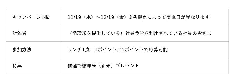 循環米の提供開始にあわせ、社食の利用を通じて抽選に参加できる「2025年新米プレゼントキャンペーン」を同時開催します。本キャンペーンは、社員食堂の利用促進に加え、循環型の取り組みから生まれた「循環米」の魅力を体験していただくことを目的としています。
