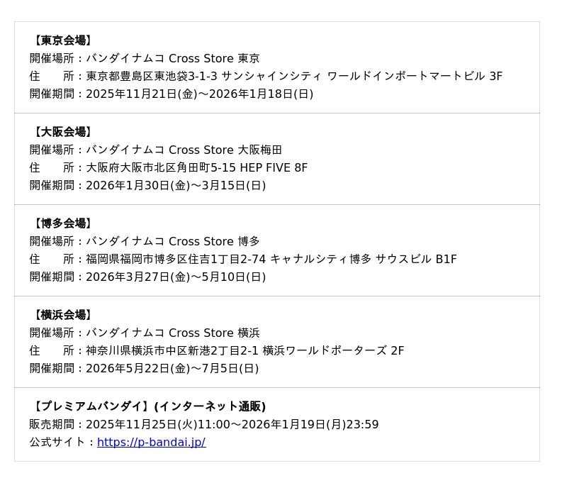 東京会場終了後は、大阪で2026年1月30日(金)から3月15日(日)まで、福岡で2026年3月27日(金)から5月10日(日)まで、横浜で2026年5月22日(金)から7月5日(日)まで開催します。今後の展開は、イベント公式サイトや公式X(旧Twitter)で順次お知らせします。