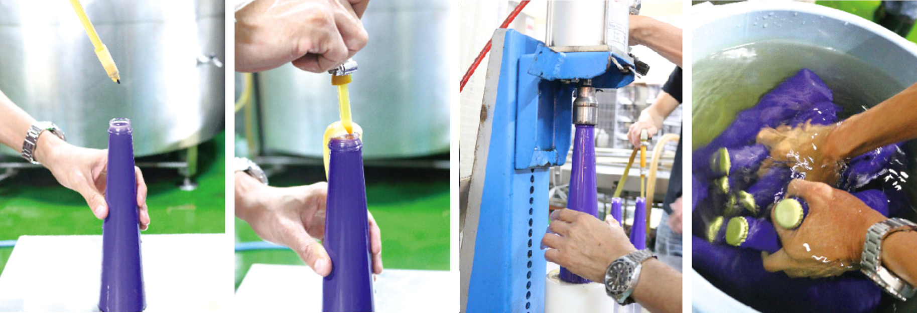 サンクトガーレンの麦のワインはシャンパンと同じ瓶内二次発酵製法で仕上げています。発酵の終了したビールから古いビール酵母を取り除き、新鮮なビール酵母と、糖分(麦汁)を添加して1本1本手作業で密封しています。