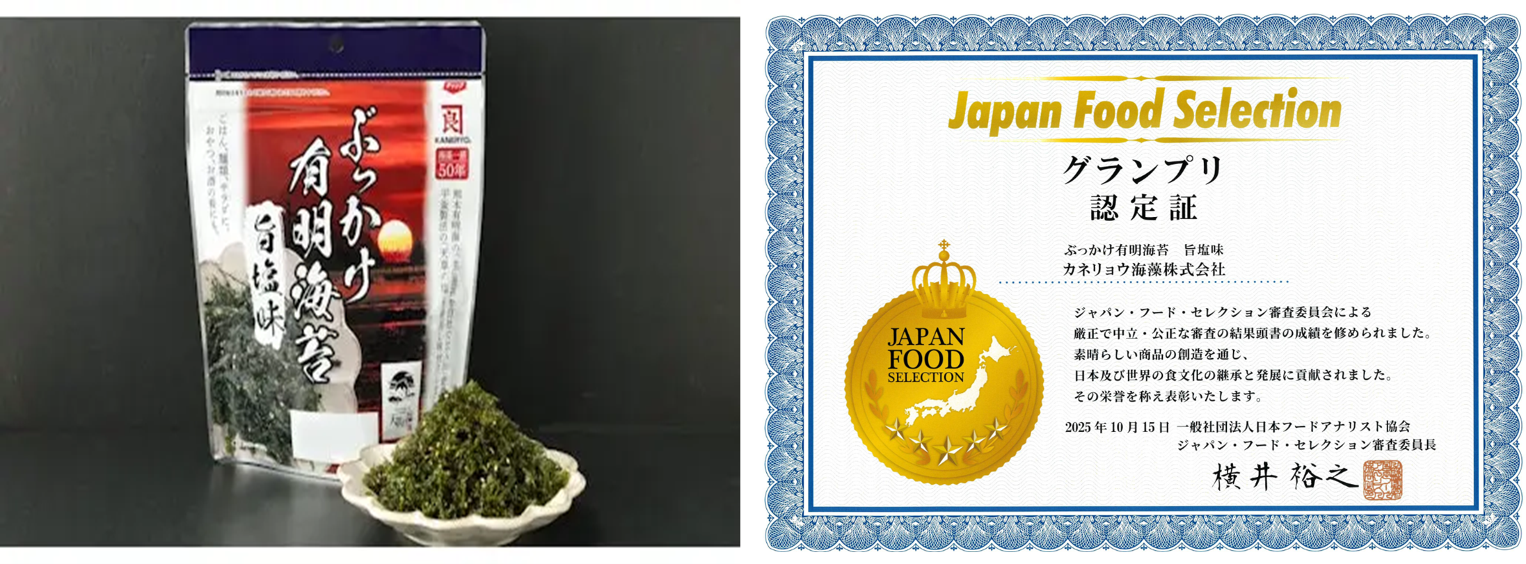 海藻の総合メーカーであるカネリョウ海藻株式会社(代表取締役社長:高木良樹、本社:熊本県宇土市、URL:https://www.kaneryo.co.jp/)が販売する人気商品「ぶっかけ有明海苔 旨塩味」が一般社団法人日本フードアナリスト協会が主催する「第92回ジャパン・フード・セレクション」食品・飲料部門において、グランプリを受賞いたしました。