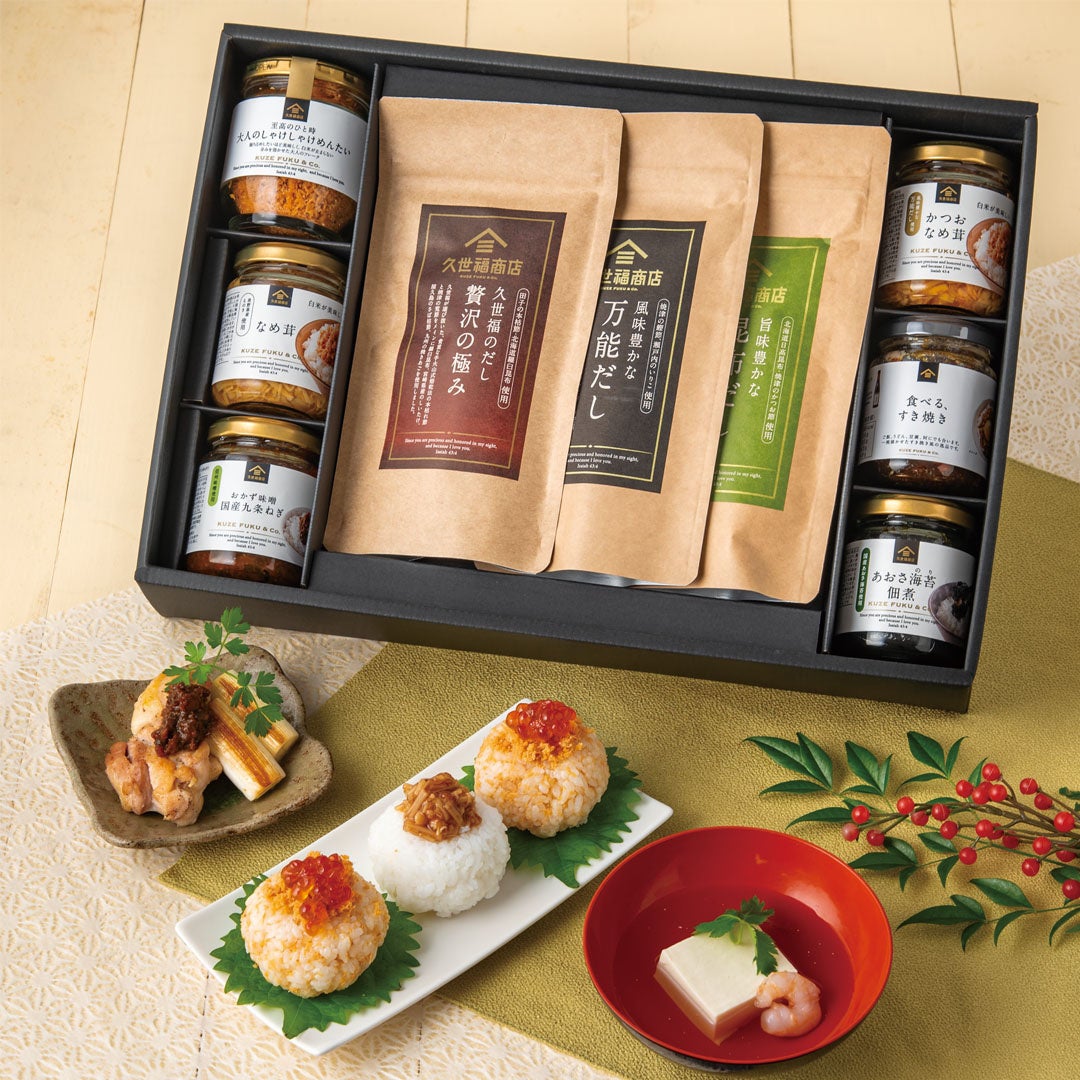 看板商品「だし」3種とごはんのお供6種を詰め合わせました。