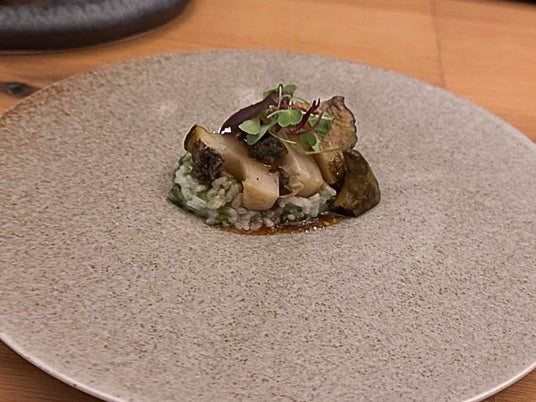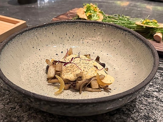 続いて登場したのは、〈アイアン・ベイ〉山下正太による「炭火香る国産きのこ」。旬のきのこの持ち味を活かしながら、薪火とスモークの香りで奥行きをもたせた一皿は、まさに“温もりと本質的な美味しさ”を体現する秋の味わいです。