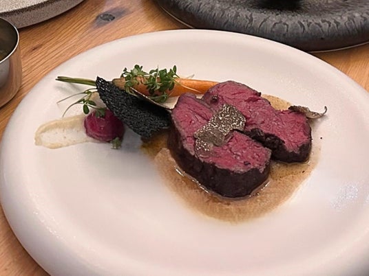 肉料理は〈Hitotsu〉野田一寿氏の「和牛横濱ビーフの薪焼き」。旬の黒トリュフの香りが肉の力強さを引き立て、戸塚産の柿を使ったソースが神奈川の恵みを象徴します。素材の持つ力と季節の豊かさを感じさせる渾身の一皿です。