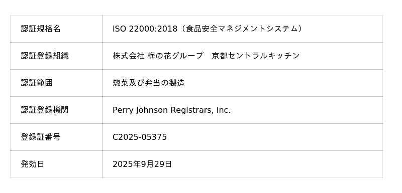 株式会社梅の花グループ(本社:福岡県久留米市、代表取締役社長COO:鬼塚 崇裕)は、2025年9月29日付で、食品安全マネジメントシステムの国際規格「ISO 22000」の認証を「京都セントラルキッチン(京都府綴喜郡井手町)」において取得いたしましたので、お知らせいたします。