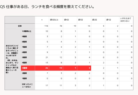 3種類以下と回答した人の約9割はコンビニヘビーユーザー(週3回以上コンビニランチ利用者)であり、コンビニ購入者全体の約1/4(25.4%)が、週3日以上を3種類以内のメニューでローテーションしていることが明らかになりました。