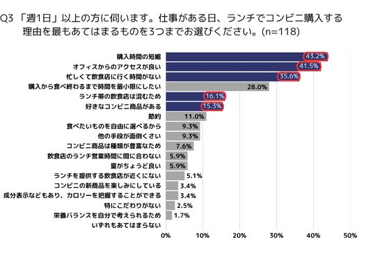 一方で、第3位に「忙しくて飲食店に行く時間がない」(35.6%)が挙がり、また「ランチ帯の飲食店は混むため」(16.1%)など、外的要因により仕方なくコンビニを利用する人(=ポジティブな理由ではない動機)も少なくはありませんでした。