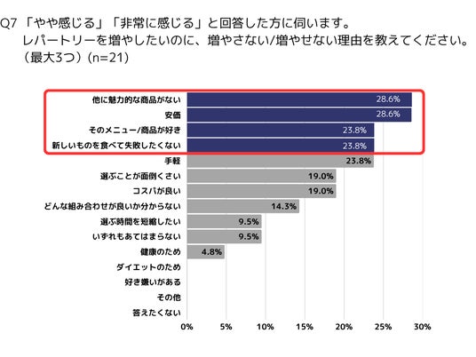 【Q7】さらに、マンネリを感じているのにレパートリーを増やさない理由(最大3つの複数回答)としては、「そのメニューが好き」(23.8%)というポジティブな意見も一定数ありました。しかし、第1位には「他に魅力的な商品がない」(28.6%)や「安さ」(28.6%)が挙げられています。