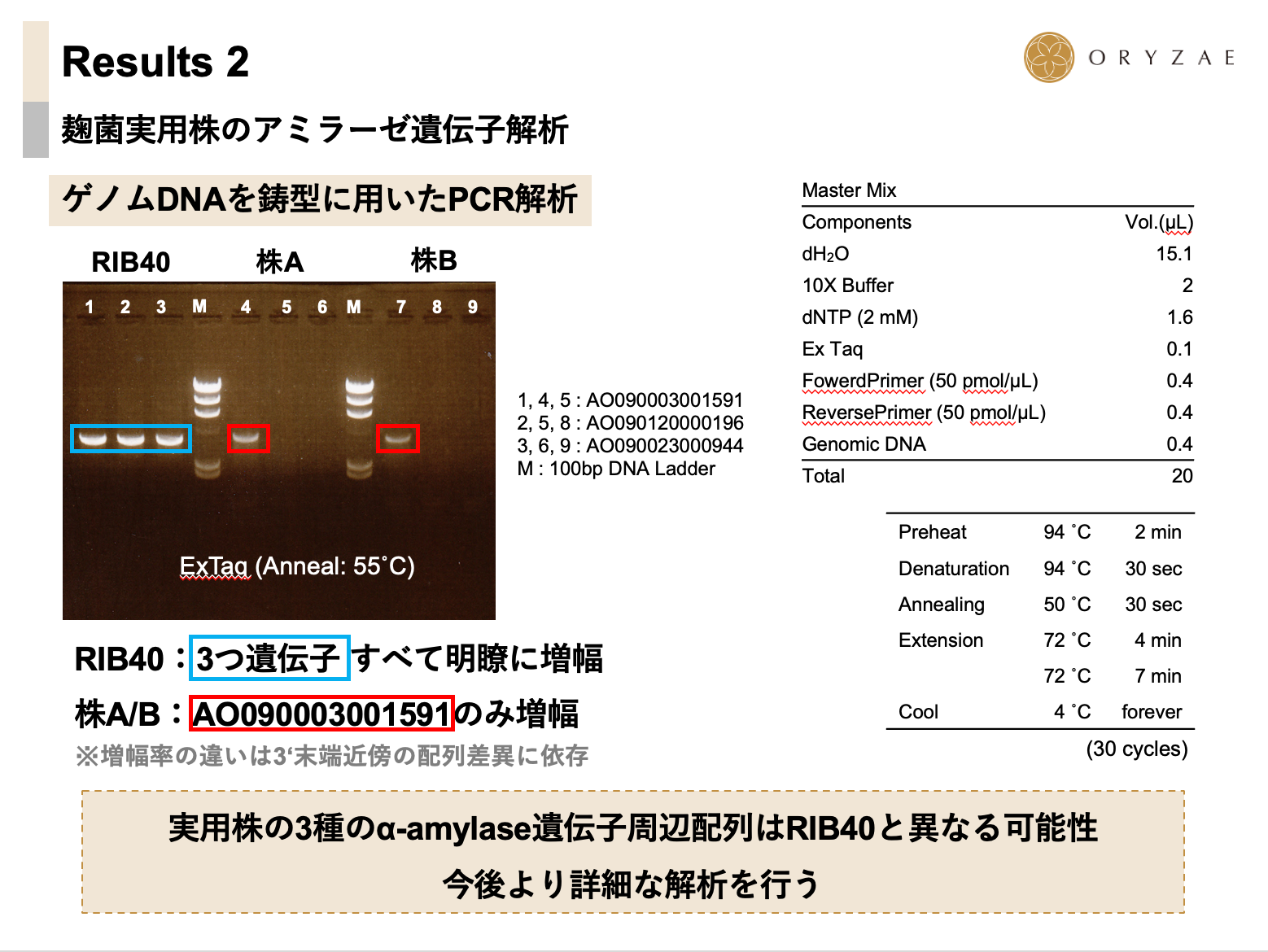 RIB40株はすでにゲノム情報が明らかにされており(*1)、3つのα-amylase遺伝子(amyA, amyB, amyC)が存在することが明らかになっています。PCRを用いた遺伝子解析の結果、麹菌実用株とRIB40株ではこれらの遺伝子の近傍の構造が異なることが示唆されました。