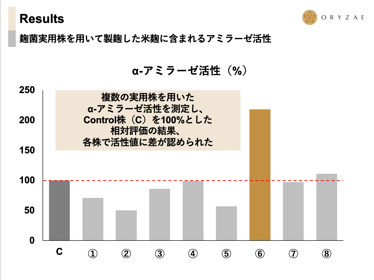 麹菌実用株8種において、α-アミラーゼ活性値に明確な差が確認されました。中には、2倍の活性の差も示され、高い酵素活性を有する株があることがわかりました。