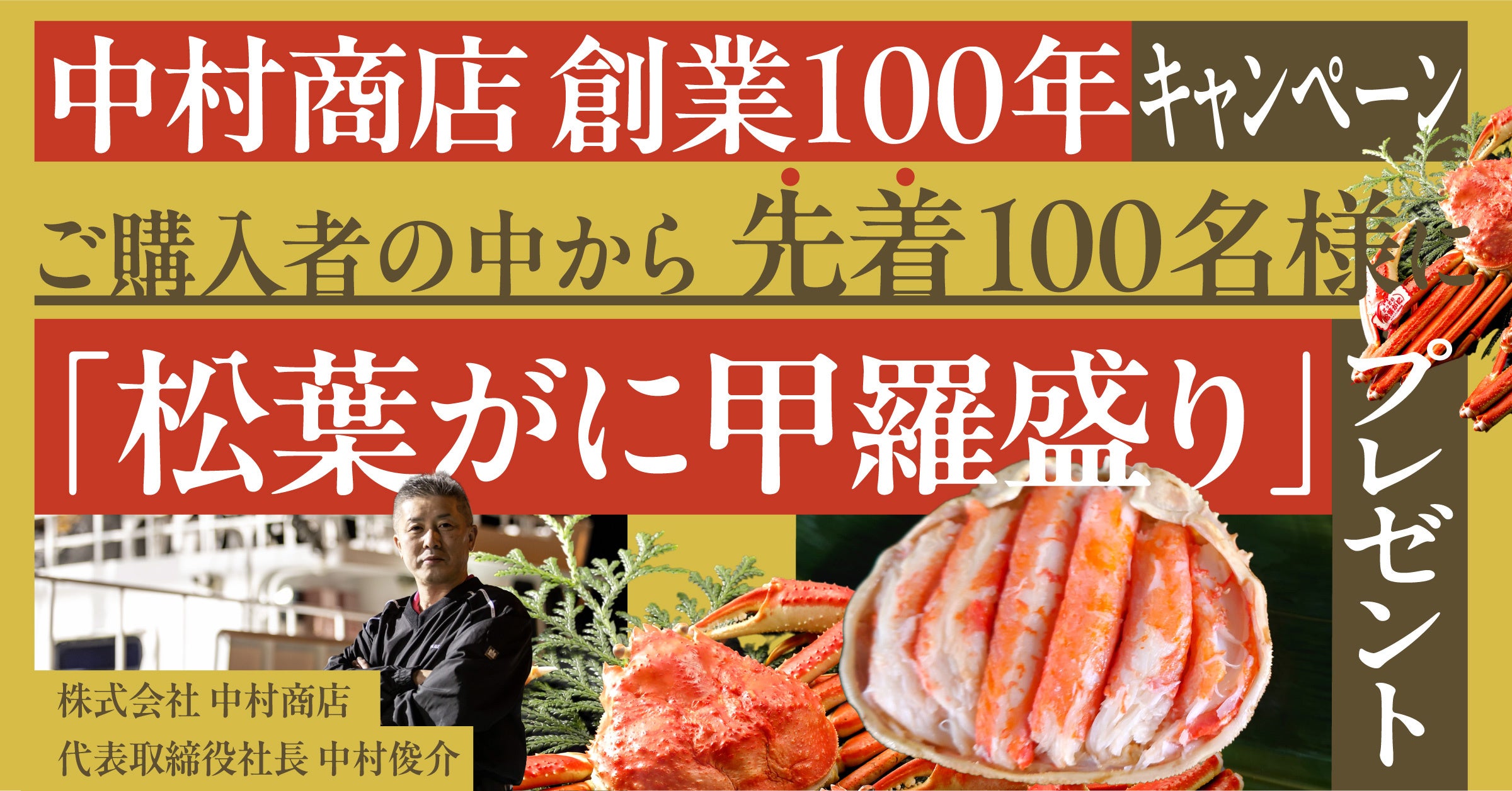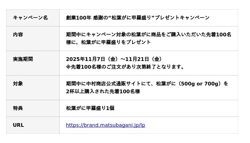 2025年11月7日(金)~11月21日(金)の期間中に、当社通販サイトで対象の松葉がに商品をご購入いただいた先着100名様に、地元鳥取で水揚げされた“松葉がに甲羅盛り”をプレゼントいたします。創業100年の節目に、中村商店の熟練の目利きが厳選した鳥取の冬の味覚を全国にお届けいたします。