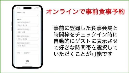 株式会社アコモ(東京都三鷹市、代表取締役:林晃治)は、宿泊施設向けに「食事予約システム」を正式リリースいたしました。本システムは、当社の「タッチレスチェックインシステム」およびPMS(宿泊施設管理システム)と連携し、ゲストによる食事時間の事前予約や施設側での予約管理をクラウド上で完結できる仕組みです。