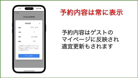従来、宿泊施設ではチェックイン時にスタッフがゲストへ食事時間を尋ね、手作業で調整を行う必要がありました。本システムでは、宿泊予約データと自動連携し、ゲストが自身のスマートフォン上で食事時間を選択できます。これにより、フロント業務の負担を軽減し、ミスやダブルブッキングの防止にも寄与します。