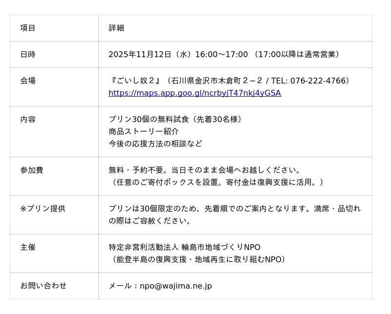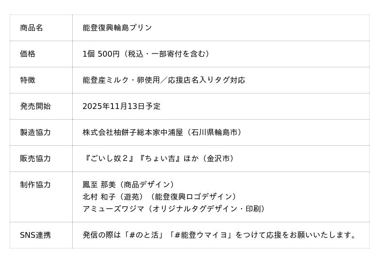 特定非営利活動法人輪島市地域づくりNPOは、能登半島地震の復興を願い、金沢の飲食店と連携し、能登産素材で作る“食べる応援スイーツ”『能登復興輪島プリン』を11月13日(木)に発売します。発売前日には金沢にて無料試食会も開催予定。買うことで能登を応援する新しい輪が広がります。