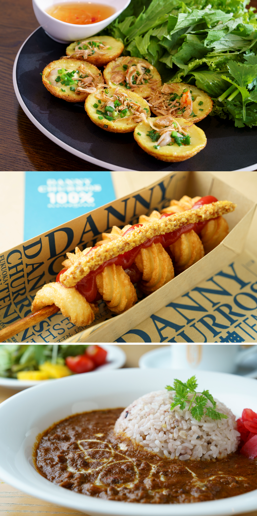 米粉グルメのワールドルートは、ベトナムのストリートフードであるバインコットからスタート!おやつにはスペインの国民的スイーツ、カリッふわっなチュロスを。そして、夜はカレーで米粉のワールドグルメを堪能する食べ歩きルートです。アジアからヨーロッパまで、「もちもち、カリふわ」なワールドグルメを巡り尽くしましょう!