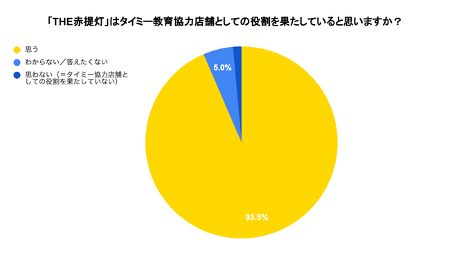 はじめて飲食店のホールスタッフとして働いたワーカーに対して「THE 赤提灯」の働きやすさを4段階評価で問うと、回答者の91.3%が最高評価の「働きやすい」と回答。「やや働きやすい」を含めると、回答者の全員が「働きやすい」と評価しています。また、「教育協力店舗としての役割を果たしていると思うか」という質問には、全体の93.5%が「思う」と回答しました。