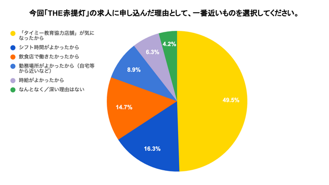 「THE 赤提灯」で働こうと思った理由について聞いたところ、最も多かったのは「『タイミー教育協力店舗』が気になったから」(49.5%)で半数近い結果に。経験・未経験に関わらず、「教育」という部分に興味を持った人が多いことがわかりました。