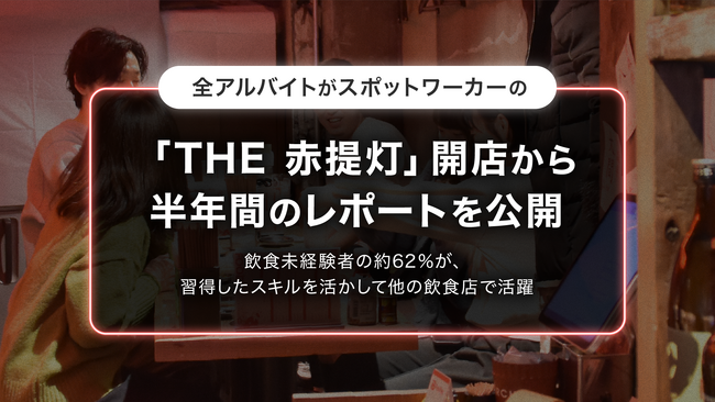 スキマバイトサービス「タイミー」を提供する株式会社タイミー(所在地:東京都港区、代表取締役:小川 嶺)は、食を通したまちづくりプロデュースや飲食店経営を展開する株式会社ミナデイン(本社:東京都港区、代表取締役:大久保 伸隆、以下ミナデイン)との協業によって2023年5月に立ち上げた、全てのアルバイトスタッフが「タイミー」ワーカー(※1)の居酒屋「新橋銀座口ガード下 THE 赤提灯(以下「THE 赤提灯」)」の開店後半年間の実績レポートを公開しました。(※1)タイミーの働き手のこと