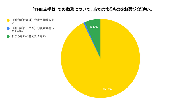 今後の勤務については、約92.8%が「今後も勤務したい」と回答。また、お客様としての来店については、88.8%が「お客様として来店したい」と答え、「すでに来店したことがある」が5.7%でした。来店したい理由として、