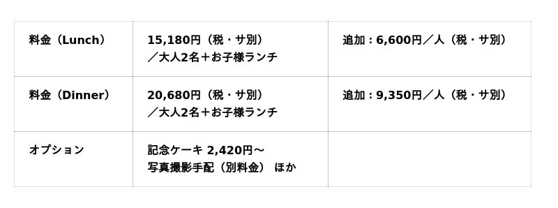 ランチ15,180円/ディナー20,680円(いずれも大人2名+お子様1名、税・サ別)。追加はランチ6,600円/ディナー9,350円(1名)と予算が立てやすい料金体系になっています。