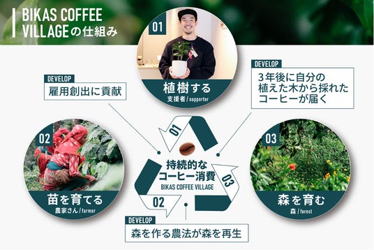 植樹プロジェクト「BIKAS COFFEE VILLAGE」は、合同会社BIKAS COFFEEが実施する、ネパール連邦民主共和国(以下ネパール)で育てたコーヒーの苗を購入し名前が付いたコーヒーの木をネパールの村に植えることができるプロジェクトです。コーヒーの木を植えることで、3年後の食を楽しめるだけでなく、森を育みながらネパール農村部の農家さんの雇用支援につなげることができます。