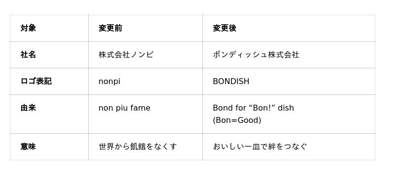 食でココロつなげるセカイをつくる“フードコミュニケーションカンパニー”株式会社ノンピ(本社:東京都千代田区、代表取締役社長 :上形 秀一郎 以下ノンピ)は、2026年1月1日より社名を「ボンディッシュ株式会社(BONDISH)」へ変更いたします。