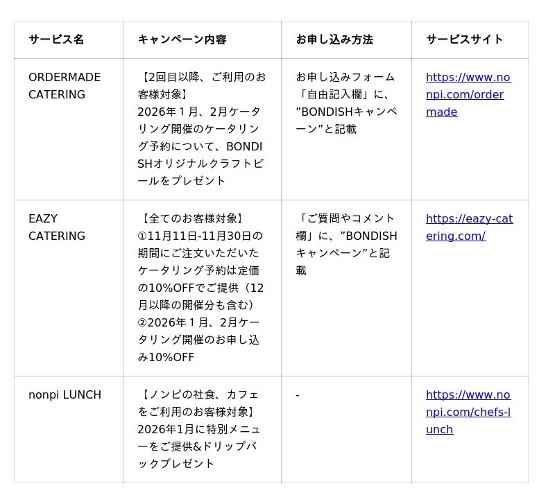 今まで、ノンピを支えてくださった皆さまに対し、感謝の念を込めて、キャンペーンを実施いたします。BONDISHに変更後も、”おいしい一皿を通して、絆を繋ぐ”価値提供を進めていきます。