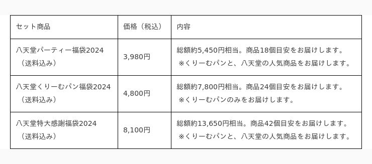 バラエティー豊かな八天堂の商品を詰め合わせた「パーティー福袋」、八天堂の代名詞であるくりーむパンを思う存分味わえる「くりーむパン福袋」のほか、八天堂の商品が大容量の42個目安で入った、お腹も心も大満足の「八天堂特大感謝福袋」をラインナップ。年末年始のご家族・ご友人でのお集りのシーンで、みんなでお楽しみいただける福袋です。