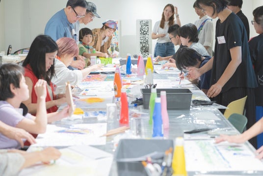本イベントでは、ブラインドコミュニケーターの石井健介氏らをファシリテーターとして迎え、視覚を遮ることで研ぎ澄まされる様々な感覚を通してお水を味わい、お水の印象を絵にしました。ワークの中で、容器の種類、形、質感や温度の違いがどのように“味わい”や“印象”に影響するのか、ファシリテーターとの対話を通して感じ取り、同じ”水”から、多様なアート作品が生まれました。