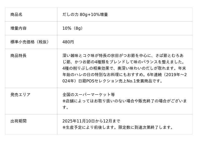 日頃のご愛顧に感謝を込めて、2025年11月中旬から数量限定での10%増量キャンペーンとなります。また、これから年末に向けては年間で最もだし・かつお節需要の高まる時期となっており、ご家庭での使用機会が増えるこの時期に合わせての実施です。さらに、11月24日は「和食の日」、11月は「和ごはん月間」でもあります。ぜひ、この機会に健康的な「和ごはん(※)」を始めてみませんか。