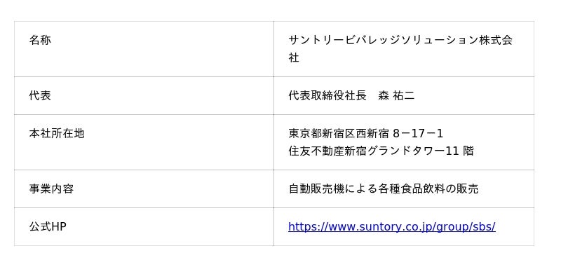 サントリービバレッジソリューションは、サントリーグループにおいて、自動販売機を中心とした多種多様な機材と機会を通じ、お客様の生活シーンのいちばん近くで、直接飲料を、そして心とからだの潤い、健やかな暮らしをお届けされています。また生活者一人ひとりの心と生活に寄り添いながら、笑顔を創造する挑戦に取り組んでいます。