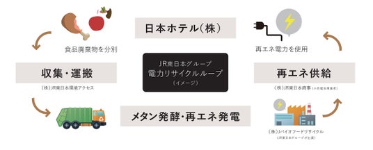 食材調達から提供に至るプロセスでの食品ロスの削減を徹底し、それでも発生する生ごみはリサイクル処理を実施。JR東日本グループで推進している「電力リサイクルループ」として、食品廃棄物の分別から再エネ発電までグループ全体で連携して取り組んでいます。