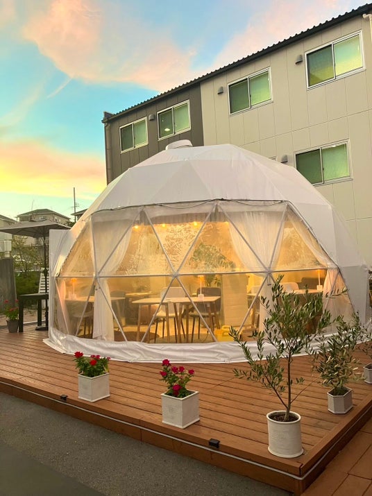 全天候型でグランピング気分を味わえる「ドーム席」は、大阪でグランピング体験ができるレストランとしても話題。