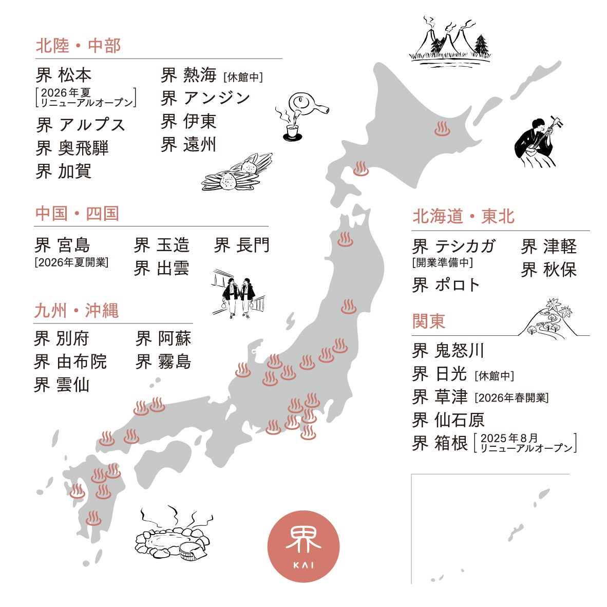 「界」は星野リゾートが全国に23施設を展開する温泉旅館ブランドです。「王道なのに、あたらしい。」をテーマに、季節の移ろいや和の趣、伝統を生かしながら現代のニーズに合わせたおもてなしを追求しています。また、その地域の伝統文化や工芸を体験する「ご当地楽」や、地域の文化に触れる客室「ご当地部屋」が特徴です。2026年夏には長野県・浅間温泉の「界 松本」がリニューアルオープン、2026年春には群馬県・草津温泉に「界 草津」、夏には広島県・宮島口温泉に「界 宮島」が開業予定です。