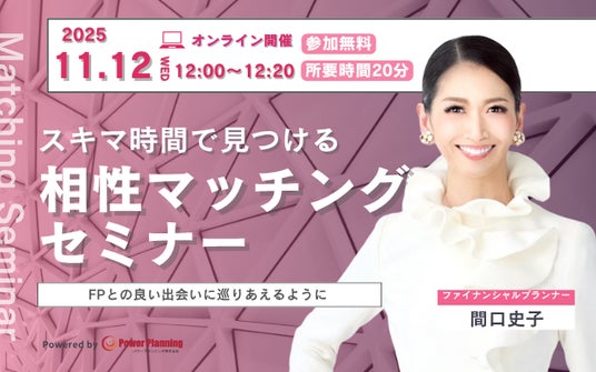 無料マネーセミナー提供サービス「アットセミナー」を運営しているパワープランニング株式会社が「11月12日(水) 18時」に「相性マッチングセミナー」というスキマ時間で自分に合ったFPを見つけられるオンラインセミナーを開催いたします。