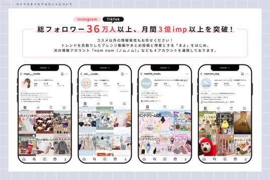 特に主要アカウントの「まよ」「うに」は1000万IMPを超える投稿を連発しております。コスメの他にも、イベント、ファッション、食品、ペットなど幅広いジャンルで、Z世代の「今のリアルなトレンド」を発信しています。