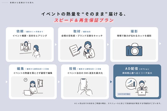 本プランは、月間3億インプレッションを誇る当社のZ世代向けライフスタイルメディアが、イベント現場に訪問~撮影~編集を行い「最短即日投稿」が実現できるものとなっております。さらにPR効果を担保する「再生保証」をパッケージ化したものです 。