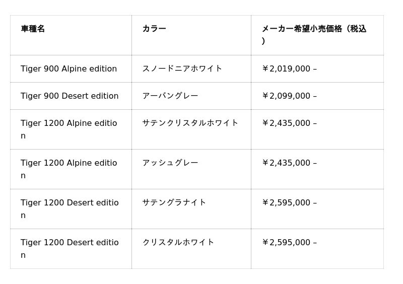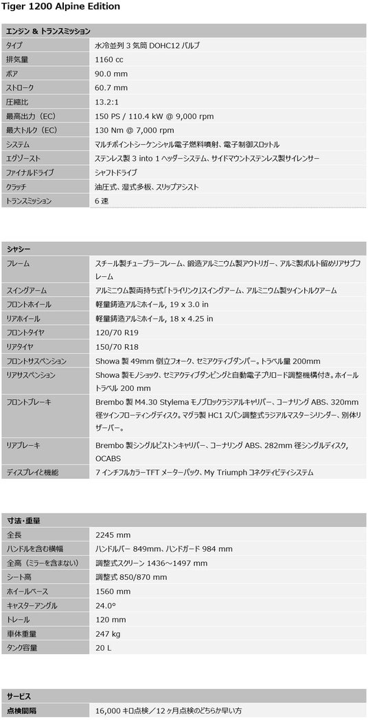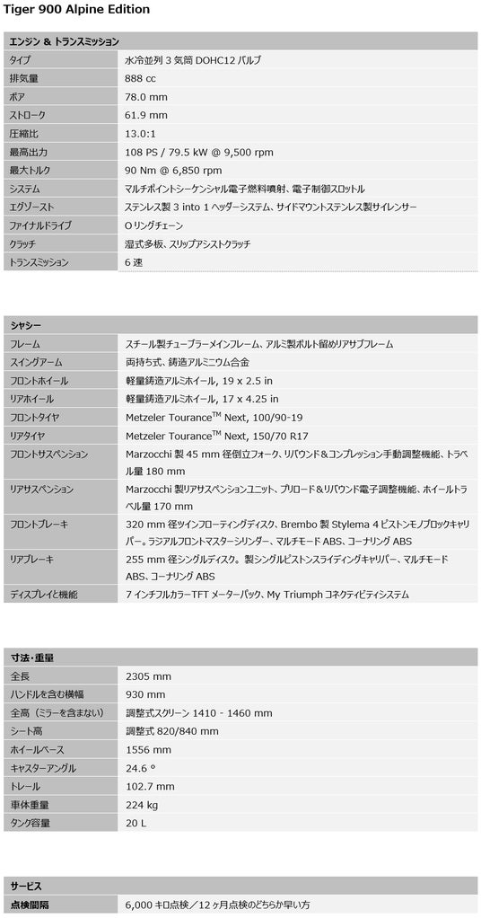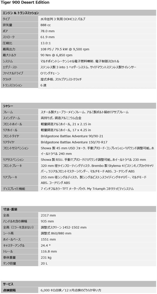 - 「Tiger 900」と「Tiger 1200」シリーズへ、魅力的な装備と価格以上の価値を持つ特別仕様車、 「Alpine Edition」 および 「Desert Edition」 を新たに追加します。