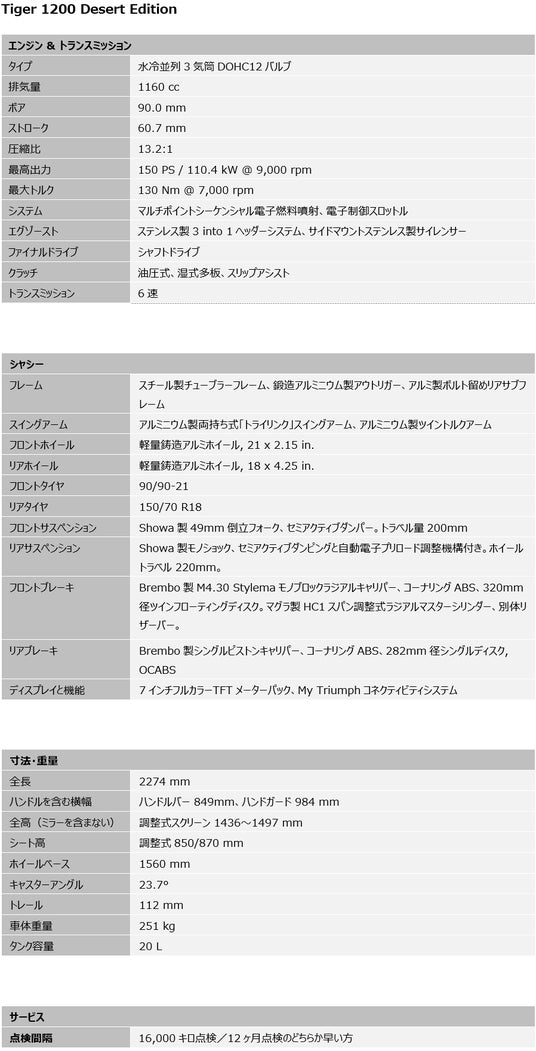 さらに、「Tiger 1200 Desert Edition」 は、2種類の独自のカラーを採用し、さまざまな地形を走るライダーに向けて、タフな走破性能と個性的なスタイルを高次元で融合させています。