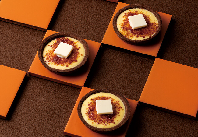 パリン、サクッ、とろりの三重奏をお楽しみください。バニラ香るクリームをパリンとブリュレした、サクッと香ばしいショコラ風味のバタータルト生地。中からとろりとあふれ出すショコラキャラメルソースが、おいしさのひと工夫。四角いバターショコラのコクも浮かべたバレンタインの“ごほうびタルト”です。
